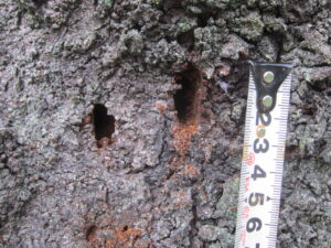 クビアカツヤカミキリ 穿入孔とフラス